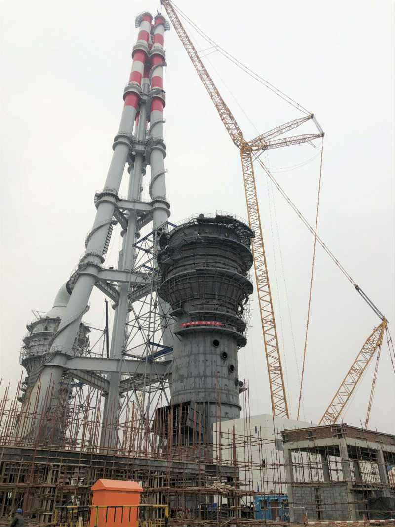 項目配套的三管自立式鋼煙囪,是國能中電引進日本三菱多管自立煙囪技術,并整合了日本鈦板貼襯技術建設而成,煙囪內徑4.5米,高度180米,分7層,總重2108t。三管自立式鋼煙囪結構合理、造型美觀。三根鋼管煙囪按正三角形布置,通過三角形鋼梁進行剛性連接,形成集束式穩定結構,每個煙囪由多個直段拼接成流線型曲線。通過整體空間結構來共同抵抗地震荷載、風荷載及其它荷載,整個煙囪結構形體規則,各向受力均勻,造型簡潔、美觀,全面融入了現代氣息和建筑美學的設計理念。自2018年8月12日開始施工建設,采用SCC9000/900噸履帶式起重機分七段進行吊裝,在參建各方的共同努力下,歷時135天,于2018年12月25日順利吊裝到頂。